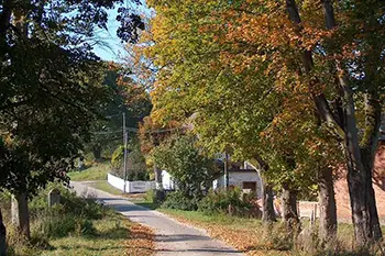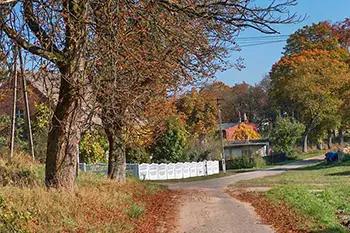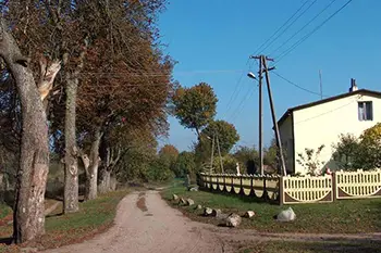 Rogówko z Brzeźniakiem łączy las, przez który wiedzie leśna droga.